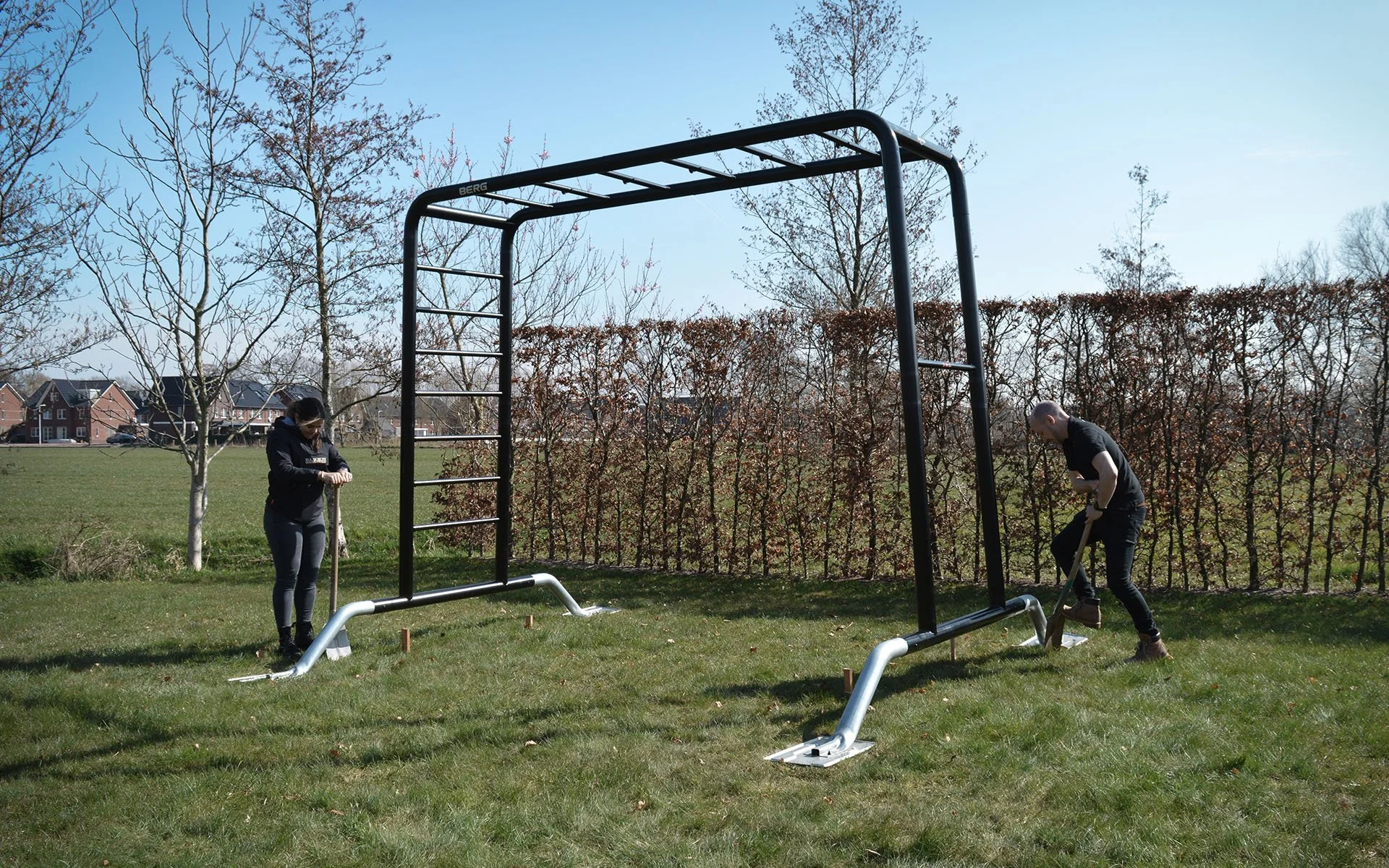 Für das Aufstellen der PlayBase benötigst du keinen Beton. Die breite Basis sorgt für eine einfache und äußerst solide Verankerung des Rahmens im Boden. Alles, was du brauchst, ist eine Wasserwaage und eine Schaufel.